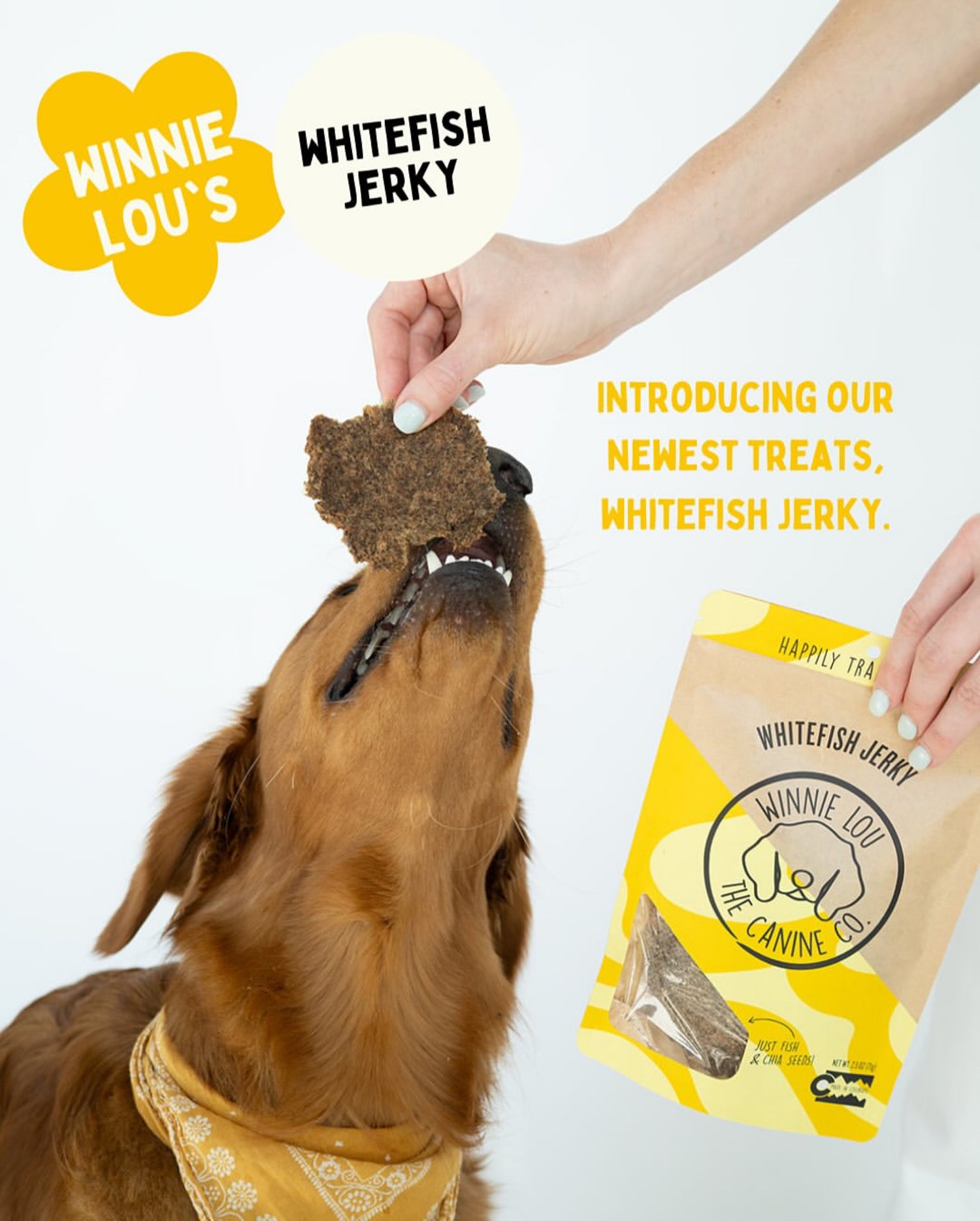 단 두 가지 원료, 생물 흰살 생선과 유기농 치아씨드로 만든 위니루 화이트피쉬 저키를 소개합니다.