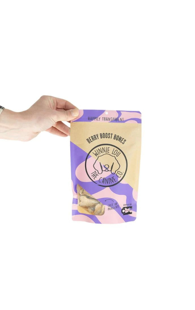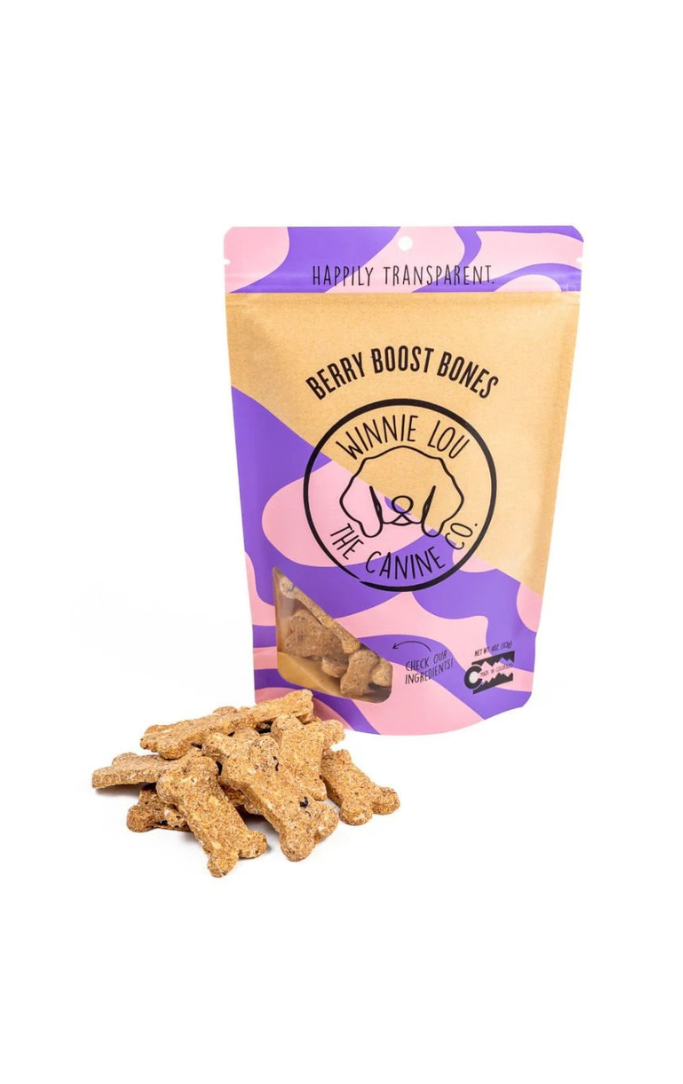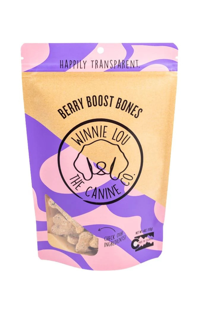 위니 루(Winnie Lou)의 그레인프리 베리 본즈(Berry Boost Bones)는 신선한 유기농 딸기, 블루베리, 크랜베리와 코코넛오일 그리고 콜로라도산 유기농 사과소스로無탄수화물 그레인-프리 밀가루를 사용해 만든 맛있고 건강한 강아지 간식입니다.